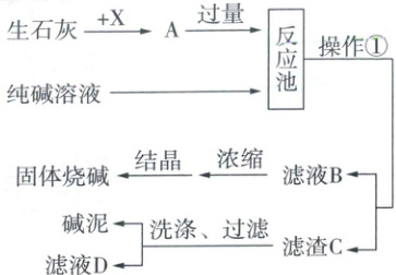 (2)操作①后得到滤液和滤渣,实现固液分离,故该操作是过滤;在反应池中,$Ca(OH)_2$过量,则得到的固体烧碱可能含少量的$Ca(OH)_2$杂质。