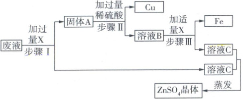 (6)步骤Ⅰ中利用金属锌置换$FeSO_4$、$CuSO_4$中的铁、铜,说明金属活动性$Zn>Fe$、$Cu$;步骤Ⅱ中$Zn$、$Fe$能与稀硫酸反应,$Cu$不能与稀硫酸反应,说明金属活动性$Zn$、$Fe > (H) > Cu$;综上可得金属活动性$Zn > Fe > (H) > Cu$。