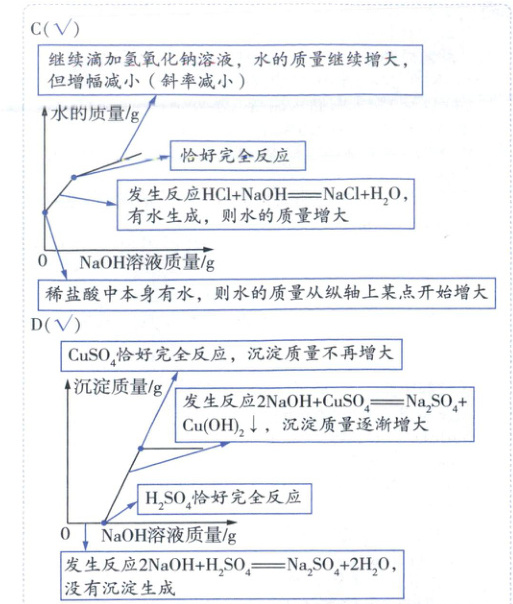 D(×)根据质量守恒定律,化学反应前后元素种类和质量不变,甲、丙中均不含氢元素,则参加反应的乙和生成的丁中氢元素质量一定相等。