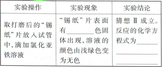 【进行实验】实验结论“猜想Ⅱ成立”,即“锡纸”中的金属是铝,铝的金属活动性比铁强,能置换出氯化亚铁中的铁,所以看到“锡纸”片表面有黑色固体出现,化学方程式为$2Al + 3FeCl_2 \longrightarrow 3Fe + 2AlCl_3$。