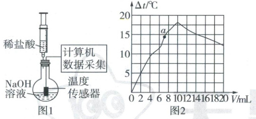10. 某实验小组按图1所示装置进行中和反应。室温下,向一定体积10%的氢氧化钠溶液中滴加10%的盐酸,用温度传感器测得溶液温度变化与加入盐酸体积的关系变化曲线如图2。下列说法正确的是(