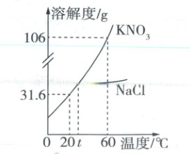 肥料。(2)焰硝经处理可得到含少量NaCl的$KNO_{3}$溶液。据下图分析:①在$t^{\circ}C$时,$KNO_{3}$的溶解度