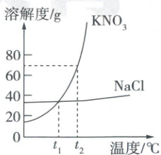 (2)由溶解度曲线可知,$t_2$℃时$KNO_3$的溶解度小于80g,即100g水中最多溶解$KNO_3$的质量小于80g,那么50g水中最多溶解$KNO_3$的质量小于40g,所以将40g硝酸钾加入50g水中,充分溶解后有硝酸钾剩余,所得溶液为饱和溶液。