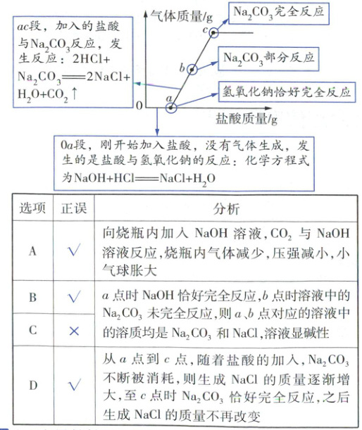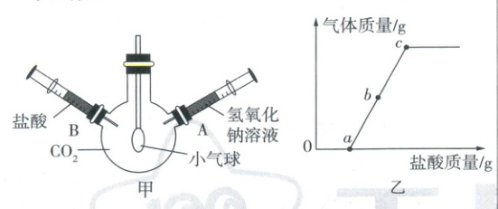 10. 实验小组同学按照图甲所示装置进行实验,同学们先将注射器A中的氢氧化钠溶液注入烧瓶内,观察到小气球发生变化,再将注射器B中的盐酸注入烧瓶,观察到有气泡产生,产生气体的质量变化如图乙所示,下列分析错误的是(