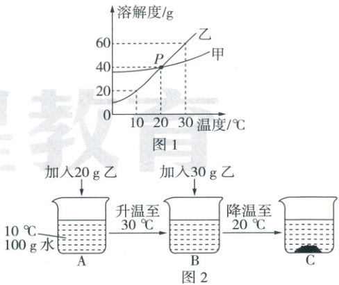 (3)10℃时,乙物质的溶解度为20g,向10℃、100g水中加入20g乙物质恰好形成饱和溶液A,乙的溶解度随温度升高而增大,升高温度至30℃时,乙的溶解度为60g,向溶液中再加入30g乙物质,溶液中溶质质量为20g + 30g = 50g<60g,形成不饱和溶液B,降温至20℃时,乙的溶解度减小至40g,所以有10g固体乙析出,形成饱和溶液C。