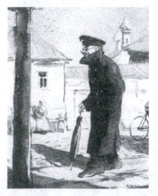 5. 班级举办课本插图配文比赛,本小组选的是课文《装在套子里的人》中的一幅插图。请为这幅插图拟写一则解说词,突出某一细节,至少运用一种修辞手法,语言表达准确、鲜明、生动,不超过100字。(6分)