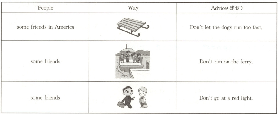 十二、 Some friends in America go to work by sled. You must drive slowly. Don’t let the dogs run too fast. Some friends go to work by ferry. You must wear a life jacket. Don’t run on the ferry. Some friends go to work on foot. You must stop at a red light. Don’t go at a red light.