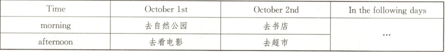 National Day is coming. Kate is going to have a busy holiday! On the morning of October 1st, she is going to the nature park. In the afternoon, she is going to see a film. On the morning of October 2nd, she is going to the bookstore to buy some books. In the afternoon, she is going to the supermarket. In the following days, Kate will visit her friends.