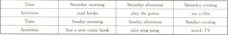 The weekend is coming. I am going to read books on Saturday morning. I am going to play the guitar on Saturday afternoon. On Saturday evening, I am going to see a film with my good friends. On Sunday morning, I am going to buy a new comic book. I am going to play ping-pong with Mike on Sunday afternoon. I am going to watch TV on Sunday evening with my grandparents.