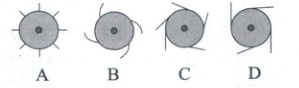 如图5-1-9所示,从上往下看(俯视),陀螺按顺时针匀速转动,此时滴一滴墨水到陀螺上,则被甩出的墨水径迹可能是选项中的哪一个(