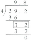 1. 妈妈买了4束菊花一共花了39.2元,每束菊花多少元?小军用竖式计算出了结果,竖式中圈出的“32”表示(