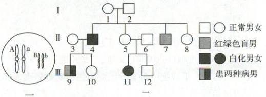 14.[2025·湖南衡阳高一检测]图一为白化病基因(用a表示)和红绿色盲基因(用b表示)在某人体细胞中分布示意图,图二为有关红绿色盲和白化病的某家庭遗传系谱图,其中Ⅲ₉同时患白化病和红绿色盲,Ⅱ₄与Ⅲ₁₁患同一种病。下列选项正确的是(
