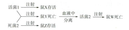 血液中分离$\overset{注射}{\longrightarrow}$活菌2$\overset{注射}{\longrightarrow}$鼠W死亡