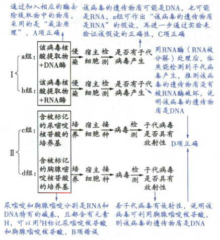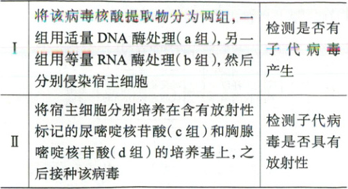 $b$组:该病毒核酸提取物 +RNA 酶 ⟶ 侵染宿主细胞 ⟶ 宿主检测是否有子代病毒产生 ⟶ 若病毒产生,说明该病毒中起控制作用的物质没有被 RNA 酶破坏,说明该病毒的遗传物质不是 RNA
