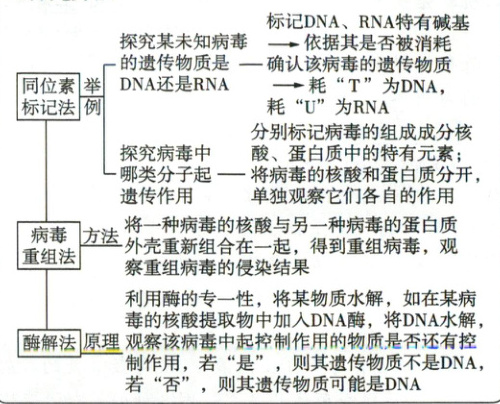 ∣ 酶解法 ⟶ 原理 ⟶ 利用酶的专一性,将某物质水解,如在某病毒的核酸提取物中加入 DNA 酶,将 DNA 水解,观察该病毒中起控制作用的物质是否还有控制作用,若“是”,则其遗传物质不是 DNA,若“否”,则其遗传物质可能是 DNA