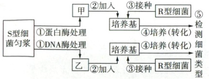 1. D 解析:步骤①中,酶处理时间要足够长,以使相应物质完全水解,A项错误。步骤②中,甲或乙的加入量属于无关变量,应相同且适宜,否则会影响实验结果,B项错误。步骤④中,液体培养基比固体培养基更有利于细菌转化,C项错误。S型细菌有荚膜,菌落表面光滑,R型细菌无荚膜,菌落表面粗糙。步骤⑤中,通过培养后观察菌落或鉴定细胞形态,判断是否出现S型细菌,D项正确。