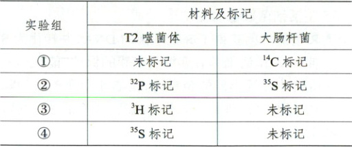 考题 5 再现 [2022·海南卷改编] 某团队从下表①~④实验组中选择两组,模拟 T2 噬菌体侵染大肠杆菌实验,验证 DNA 是遗传物质。结果显示:第一组实验检测到放射性物质主要分布在沉淀物中,第二组实验检测到放射性物质主要分布在上清液中。该团队选择的第一、二组实验分别是(