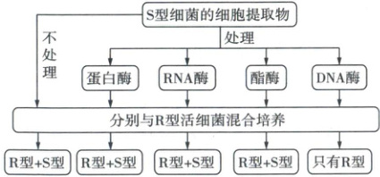 2. B 解析:将S型细菌的细胞提取物分别与R型活细菌混合培养,转化率较低,故同时长出两种菌落的培养基中,R型细菌的菌落数较多,A项正确;蛋白质可与双缩脲试剂反应呈紫色,但由于蛋白酶的本质也是蛋白质,故检验蛋白酶能否彻底去除蛋白质,不能使用双缩脲试剂,B项错误;“减法原理”是排除自变量对研究对象的干扰,同时尽量保持被研究对象的稳定,该实验利用了“减法原理”,通过去除细胞提取物中的某一物质来验证它的作用,C项正确;本实验中有DNA的组别能得到S型细菌,但加入DNA酶后,DNA被水解的组别只有R型细菌,该实验结果表明促使R型活细菌转化为S型细菌的转化因子很可能就是DNA,D项正确。