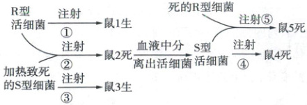 1. C 解析:该实验证明加热致死的S型细菌中存在“转化因子”,能将R型细菌转化为S型细菌,但不能证明“转化因子”是S型细菌的DNA,A项错误。从鼠2血液中分离出来的活细菌包括R型细菌和S型细菌,其中只有S型细菌能使小鼠死亡,B项错误。由过程④可知,注射S型活细菌的小鼠死亡,而结合过程②的结果可表明存在一种促使R型活细菌转化成S型活细菌的活性物质,C项正确。S型活细菌不能使死的R型细菌转化为R型活细菌,从鼠5体内只可分离出S型活细菌,在培养基上培养,只会产生表面光滑的菌落,D项错误。