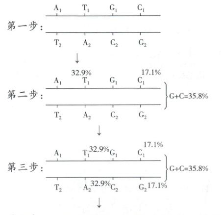 【例 2】 已知某双链 DNA 分子中,G 与 C 之和占全部碱基总数的 35.8%,其中一条链中的 T 与 C 分别占该链碱基总数的的 32.9% 和 17.1%。则在它的互补链中,T 和 C 分别占该链碱基总数的(