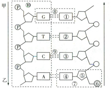 (3)图中⑩示意的是一条脱氧核苷酸链的片段,与另一条片段反向平行,有游离磷酸基团的一端(甲)是脱氧核苷酸链的 5'端,箭头指向的一端(乙)为 3'端。