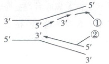 ①和②两条单链都是新合成的,已知①的$5'$端指向解旋方向,如图,那么②的$3'$端会指向解旋方向,②延伸方向为$5'$端至$3'$端,②的模板链的$5'$端指向解旋方向,沿模板链的$3'$端至$5'$端复制,$D$项错误。