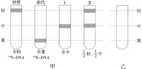 (甲图:对照:轻:$^{14}N-DNA$,全轻;亲代:重:$^{15}N-DNA$,全重;Ⅰ:中,全中;Ⅱ:轻、中,$\frac{1}{2}轻、\frac{1}{2}中$。乙图:轻、中、重。)
