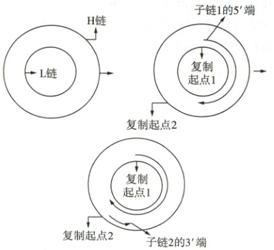 (线粒体DNA的结构和复制,H链为外环,L链为内环,复制起点1、2,子链1的$5^{'}$端,子链2的$3^{'}$端。)
