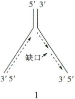 (图1:DNA的半不连续复制,缺口,$3^{'}5^{'}$,$5^{'}3^{'}$,$3^{'}5^{'}$。)