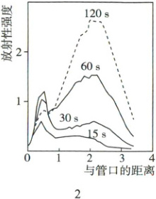 (图2:放射性强度与管口的距离,15、30、60、120s时的曲线。)