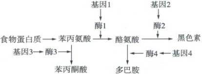 解析 苯丙酮酸、多巴胺和黑色素的异常与酶的合成有密切的关系,而酶的合成是由基因控制的;若基因1发生变化,则多巴胺和黑色素的合成都受影响;多巴胺和黑色素的合成都受多个基因的控制。