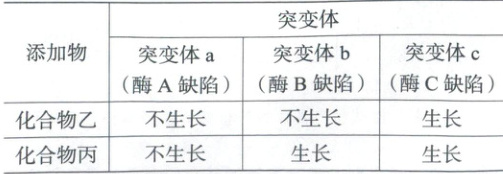 解析 突变体 a 缺乏酶 A,在基本培养基上添加化合物乙或丙均不能生长,说明酶 A 催化丙转化为丁的过程;突变体 b 缺乏酶 B,在基本培养基上添加化合物乙不能生长,添加化合物丙能生长,说明酶 B 催化乙转化为丙的过程;突变体 c 缺乏酶 C,在基本培养基上添加化合物乙或丙均能生长,说明酶 C 催化甲转化为乙的过程。故酶 A、酶 B、酶 C 在该反应链中的作用顺序依次是酶 C、酶 B、酶 A。