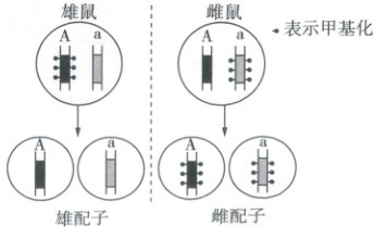 15. ACD 解析:雄鼠中A基因发生了甲基化,不能表达,但a基因可表达,雌鼠中a基因发生了甲基化,不能表达,但A基因可表达,A基因具有促生长的作用,a基因无此功能,因此雌雄鼠基因型相同,表型不相同,A项错误;所有雄鼠的精子都是非甲基化的,其原因可能是在雄鼠体内有去甲基化机制,B项正确;设甲基化的基因用1标记,则$A_1a$雄鼠产生的雄配子为$A:a=1:1$,$Aa_1$雌鼠产生的雌配子为$A_1:a=1:1$,因此雌雄鼠杂交子代的基因型和比例为$AA_1:A_1a:Aa_1:aa_1=1:1:1:1$,发生甲基化的A基因不能表达,因此子代表型比例为$1:1$,C项错误;DNA甲基化修饰通常会抑制基因的表达,但不改变基因碱基序列,即被甲基化的DNA片段中遗传信息不发生改变,D项错误。
