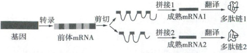 11. CD 解析:基因转录时需要RNA聚合酶与启动子识别结合,以启动转录,启动子、终止子在DNA上,A项正确,D项错误;翻译的模板是成熟的mRNA,原料是氨基酸,发生的场所是核糖体,运输氨基酸的工具是tRNA,该过程还需要ATP提供能量,B项正确;题图中基因通过转录形成了两种mRNA,翻译形成了两种多肽链,说明基因与多肽链之间不是一一对应的关系,C项错误。