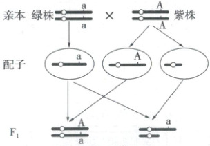 。 3. 玉米株色紫色对绿色是显性,分别由基因A和a控制。纯合紫株玉米与纯合绿株玉米杂交,F₁植株均表现为紫色。研究人员用X射线照射纯合紫株玉米的花粉后给绿株授粉,F₁中出现了绿株,如图所示。下列相关叙述正确的是(