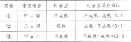解析:根据实验③,可推测相对性状成熟与不成熟至少由两对独立遗传的等位基因控制,根据丙的基因型为${aaBB}$,表现为成熟,且${B}$基因控制合成的酶能够催化乙烯的合成,可推测基因型为${A_B_}$、${A_bb}$、${aabb}$的个体表现为不成熟。由于甲、乙、丙都是纯合子,甲、乙表现为不成熟,丙表现为成熟,根据实验①,推测甲的基因型为${AABB}$;根据实验②,推测乙的基因型为${aabb}$,则实验③的${F_{1}}$为${AaBb}$,${F_{2}}$成熟个体的基因型为${aaB_}$,包括${aaBB}$和${aaBb}$;${F_{2}}$不成熟个体的基因型为${A_B_}$、${A_bb}$、${aabb}$,占${F_{2}}$个体的比例为$13/16$,不成熟个体中纯合子的基因型为${AABB}$、${AAbb}$、${aabb}$,占${F_{2}}$个体的比例为$3/16$,所以${F_{2}}$不成熟个体中的纯合子占$3/13$。