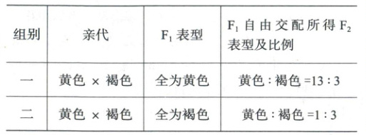 解析 第二组中黄色和褐色杂交后代全是褐色,且 $F_1$ 自由交配,$F_2$ 黄色 : 褐色 = $1:3$,则亲本的基因型是 $aadd×AAdd$,$F_1$ 的基因型是 $Aadd$,只有一对杂合子,则 $F_2$ 出现性状分离是基因分离的结果,A 项错误。第一组中 $F_2$ 黄色 : 褐色 = $13:3$,为 $9:3:3:1$ 的变式,因此第一组的 $F_1$ 的基因型为 $AaDd$,亲本的基因型是 $aaDD×AAdd$,即【方法】$13 = 9 + 3 + 1$,进行组合分析基因型与性状的关系,确定亲本基因型