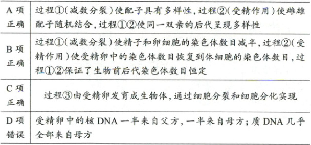 B项 过程①(减数分裂)使精子和卵细胞的染色体数目减半,过程②(受精作用)使受精卵中的染色体数目恢复到体细胞的染色体数目,过程①②保证了生物前后代染色体数目恒定正确