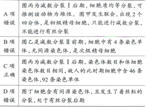 图丙为减数分裂Ⅰ后期,染色体数目和体细胞染色体数目相同,故人的此时期细胞中含$46$条染色体,$92$条染色单体,C项正确。