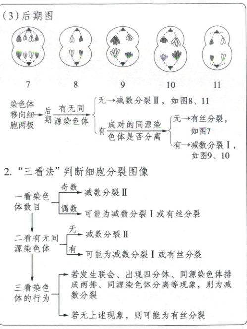 染色体移向细胞两极 $\begin{cases} 无同源染色体: \begin{cases} 有成对的同源染色体是否分离: \begin{cases} 无→减数分裂Ⅱ, 如图8、11\\ 有→减数分裂Ⅰ, 如图9、10 \end{cases} \end{cases}\\ 有同源染色体: \begin{cases} 无: 减数分裂Ⅰ\\ 有: 有丝分裂, 如图7 \end{cases} \end{cases}$