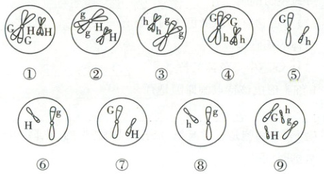 15. [2025·山东潍坊高一检测][不定项选择]某含 4 条染色体的雄性动物的基因型为 GgHh,且两对等位基因分别位于两对同源染色体上。图中①~⑨表示该动物不同细胞分裂过程产生的子细胞。在不考虑突变和互换的情况下,下列叙述正确的是(
