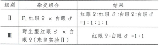 1. 摩尔根在野生型红眼果蝇中偶然发现了一只白眼雄果蝇,他用这只果蝇与野生型红眼雌果蝇进行杂交(实验Ⅰ),结果 F₁全部为红眼。F₁雌雄果蝇相互交配,F₂中雌果蝇全部为红眼,雄果蝇中红眼和白眼的比例为 1:1。这种现象不能用孟德尔的遗传理论解释清楚。于是他继续做了如下表所示的实验(Ⅱ、Ⅲ)。