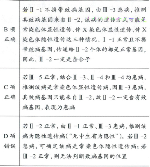 正确 若Ⅱ -1 不携带致病基因,由Ⅲ -3 患病,推测其致病基因来自Ⅱ -2,该病的遗传方式可能是常染色体显性遗传、伴 X 染色体显性遗传、伴 X 染色体隐性遗传这三种情况,Ⅰ -1 正常且不携带致病基因,传递给Ⅱ -2 个体的都是正常基因,因此,Ⅱ -2 一定是杂合子