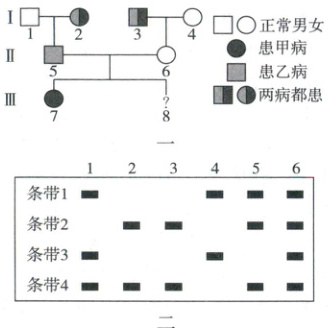 13. [2025·广东东莞高一检测]图一是某家系甲、乙两种常染色体单基因遗传病的系谱图。图二是该家系中1~6号成员两种遗传病相关基因的电泳图(每种条带代表一种基因,“■”表示具有相关的基因)。下列有关叙述正确的是(