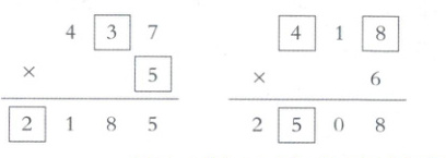 第一个竖式437×5=2185(□依次填3、5、2),第二个竖式418×6=2508(□依次填4、1、8、5)