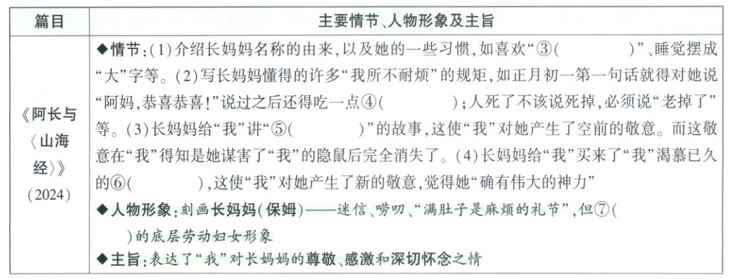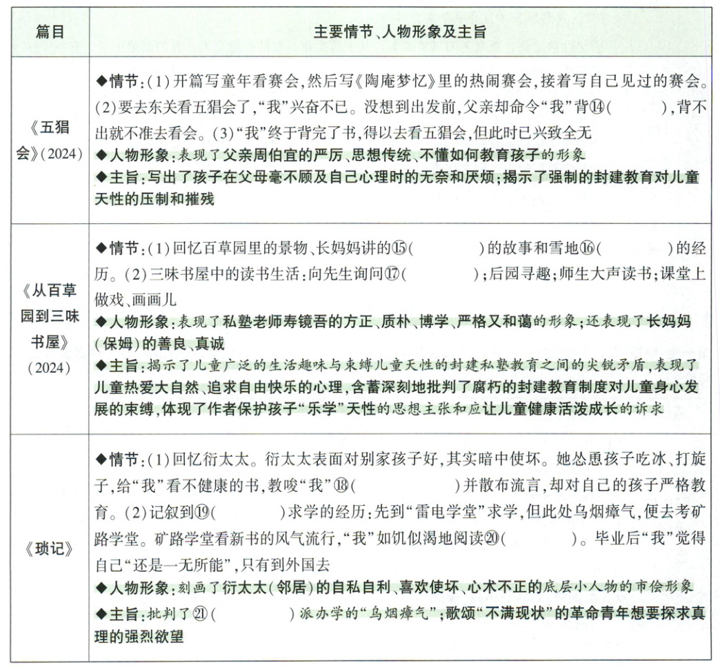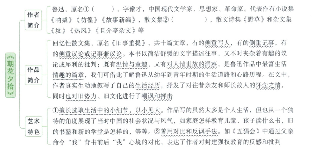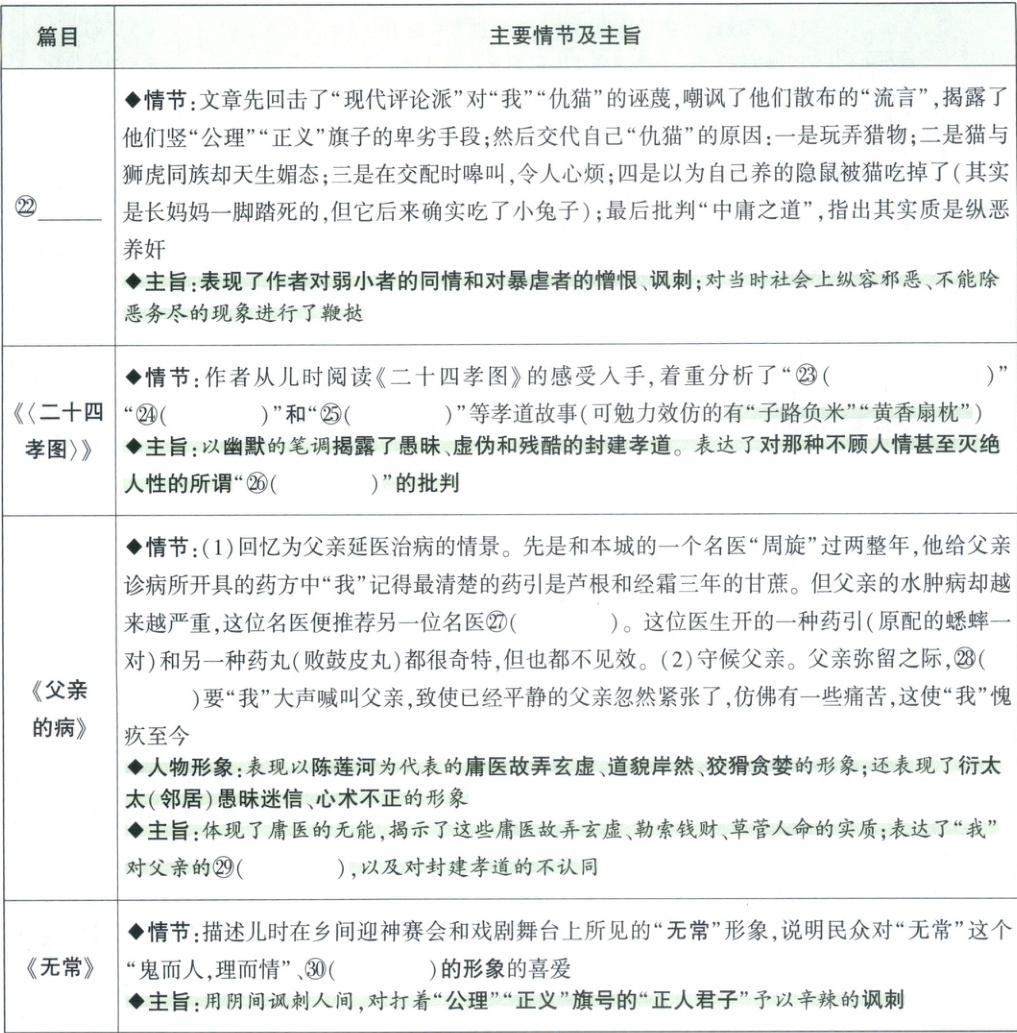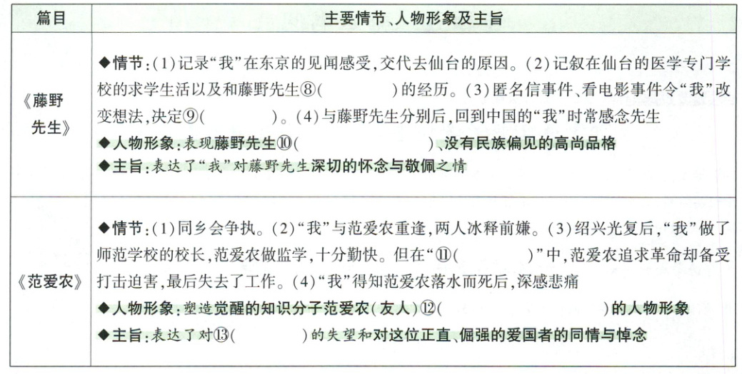 梳理答案:③切切察察 ④福橘 ⑤美女蛇 ⑥《山海经》 ⑦善良、朴实、乐于助人 ⑧相识、相处 ⑨弃医从文 ⑩正直热诚、治学严谨 ⑪报馆案风波 ⑫倔强耿直、愤世嫉俗、有责任心 ⑬旧民主革命