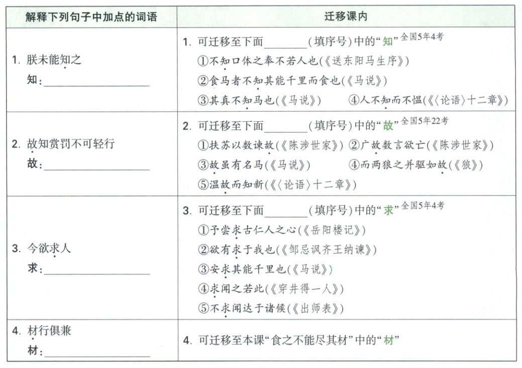 (2)①定语后置的标志,不译 ②结构助词,的 ③代词,指千里马 ④助词,起调节音节、舒缓语气的作用,不译