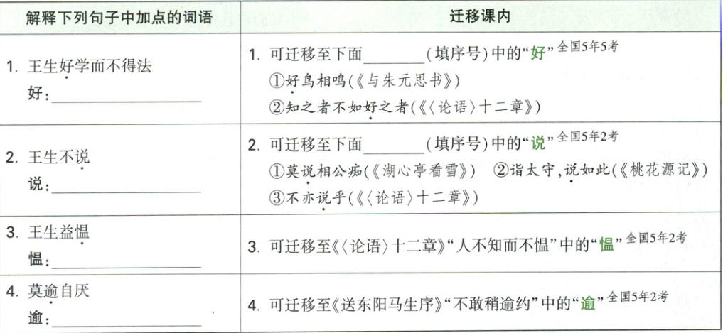 王生好学而不得法。其友李生问之曰:“或谓君不善学,信乎?”王生不说,曰:“凡师之所言,吾悉能志之,是不亦善学乎?”李生说之曰:“盖学贵善思,君但志之而不思之,终必无所成,何以谓之善学也?”王生益愠,不应而还①走。居五日,李生故寻王生,告之曰:“夫善学者不耻下问,择善而从之,冀②闻道也。余一言未尽,而君变色以去。几欲拒人千里之外,其择善学者所应有邪?学者之大忌,莫逾自厌,盍改之乎?不然,迨③年事蹉跎,虽欲改励④,恐不及矣!”王生惊觉,谢曰:“余不敏,今日始知君言之善。请铭之坐右,以昭炯戒⑤。”