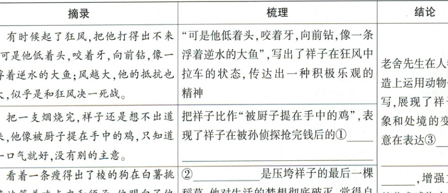 7. (2025 唐山模拟)“新考法 专题探究”小山同学对《骆驼祥子》进行了“动物化描写与人物塑造”专题 探究。下面是他的阅读笔记,请帮他完善。(6 分)