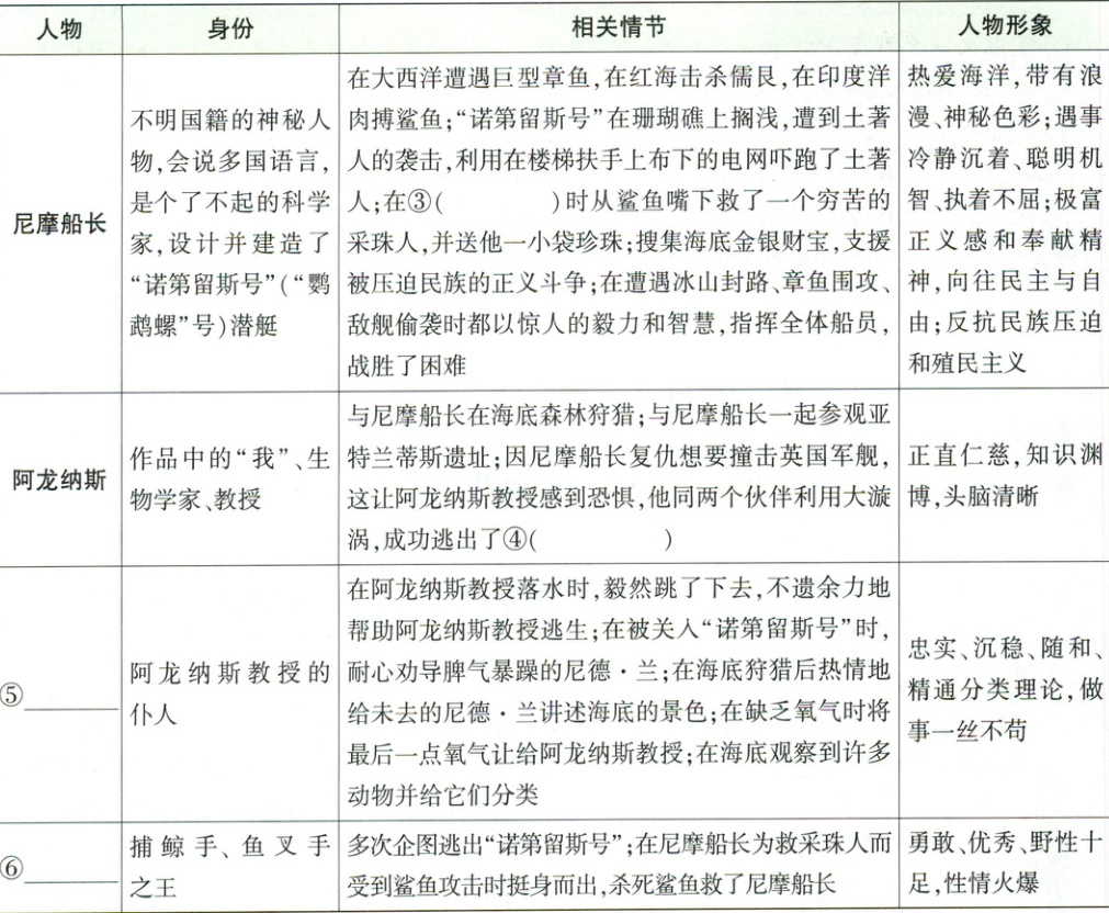 ③印度洋采珠场 ;④诺第留斯号(鹦鹉螺号) ;⑤康塞尔 ;⑥尼德·兰